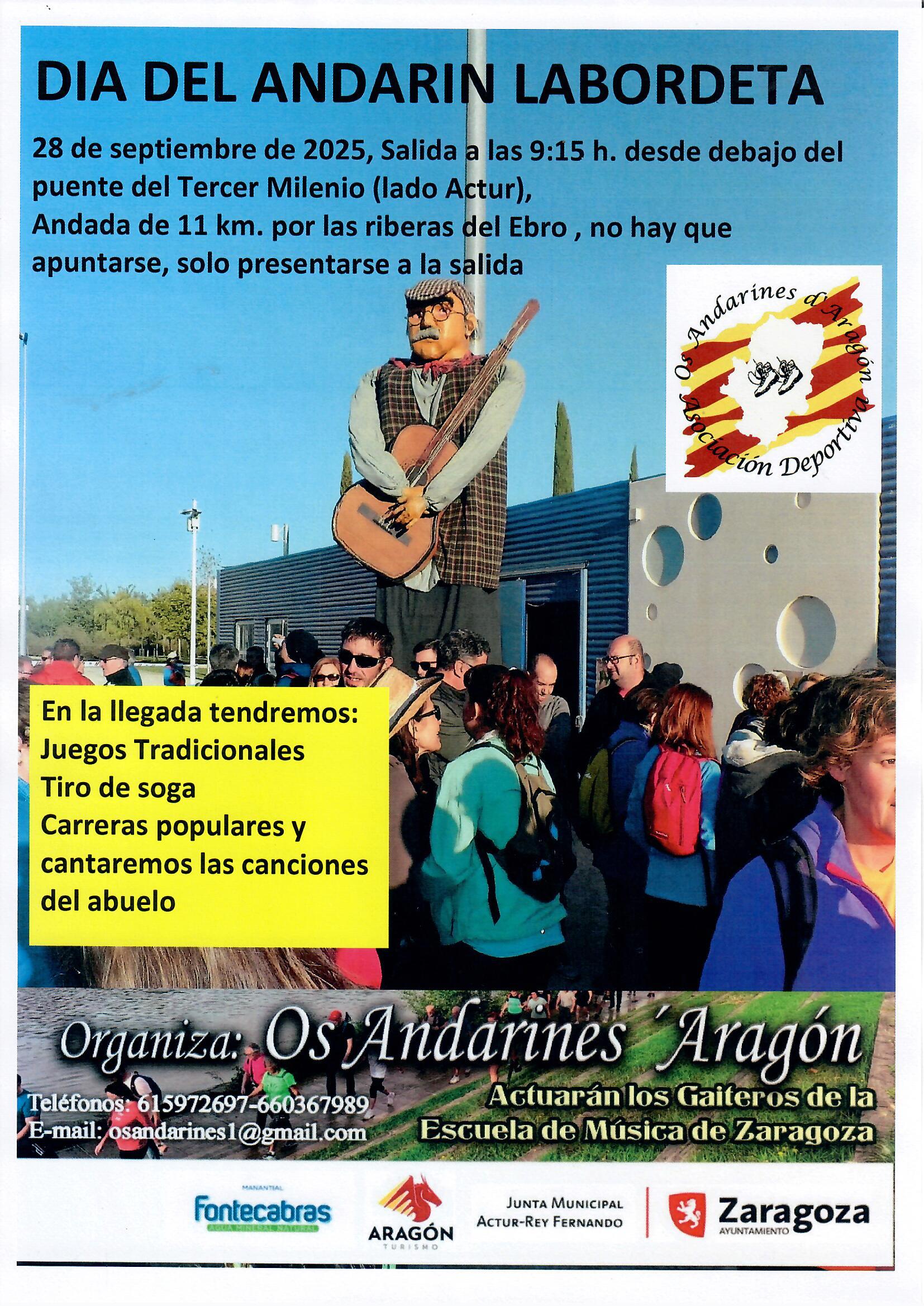 El próximo domingo 28 de septiembre de 2025 en el Parque del Agua de Zaragoza a las 9:15 h. Os Andarines d’Aragón organizamos la XVº DIA DEL ANDARIN LABORDETA, andada de 11 km por las riberas de Ebro, la cita este año, debajo del puente del Tercer Milenio (lado Actur).