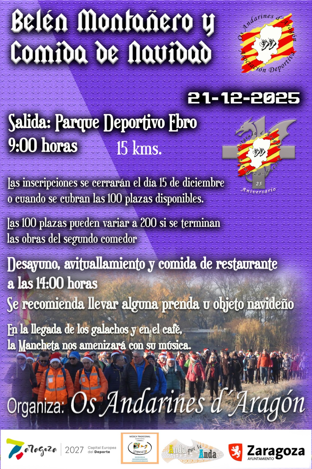 daremos la salida, el recorrido por las riberas del Ebro hasta el centro de interpretación de los Galachos, allí tendremos el degustación de dulces, continuaremos la andada otra vez siguiendo las riberas del Ebro, la llegada será al Centro Deportivo Ebro, donde nos recibirá la Mancheta grupo de acordeonistas con villancicos y canciones de Navidad, sobre las 14:00 h., en el restaurante nos habrán preparado la comida que consistirá en un menú con dos platos a elegir en el boletín de inscripción.