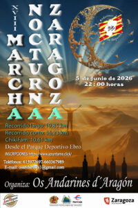 El próximo 5 de junio de 2026, Os Andarines de Aragon organizan la XVIIIº MARCHA NOCTURNA DE ZARAGOZA, andada con tres recorridos de 19,85, 16,23 y 10,61 km. recorriendo senderos por las riberas del Ebro y montes de Juslibol con avituallamientos, cena de huevos fritos con longaniza y jamón, regalos y muchos mas servicios con el sello de Os Andarines de Aragón.